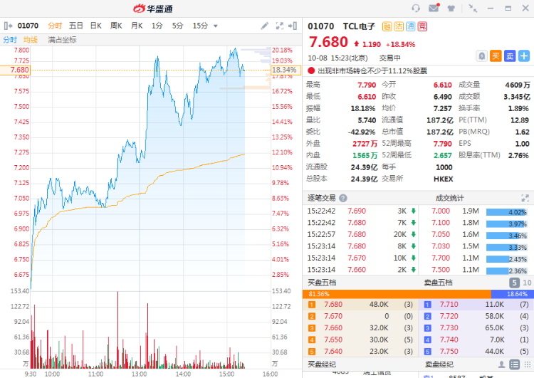 10月8日消息,TCL电子午后一度涨近20%,截至发稿报价7.68港元,涨幅18.3%,最新市值187.2亿港元。股价再创逾5年新高。