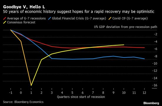 V型经济复苏的想法不但嵌入央行的模型中,在投资者的思路裏也根深蒂固。但彭博经济研究针对1965年以来七国集团国家36次经济衰退的分析发现,L型经济复苏的可能性大于V型。在全球今年冬季将面临第二波新冠病毒疫情下,不难想像其对经济长期破坏程度超出了预测人员的预期。