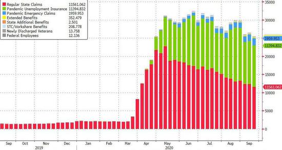 但这可能也没有反映真实的失业情况。可能的解释是,申请人已经用尽了常规福利,进而转向提供拓展福利的州计划。例如9月19日当周,过渡到“疫情紧急失业补偿”项目的美国人数增加了15.3700万,至总数196万人,该项目是已经用尽州福利的人们可以申请的联邦援助计划。