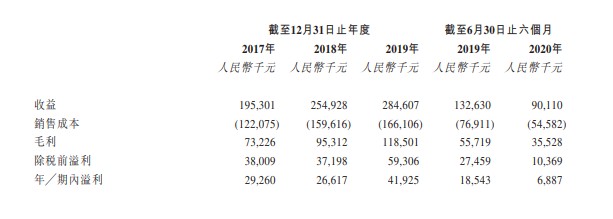 于2017年、2018年及2019年,集团收益分别为1.95亿元(人民币,下同)、2.55亿元及2.85亿元;毛利分别为7323万元、9531万元及1185万元。