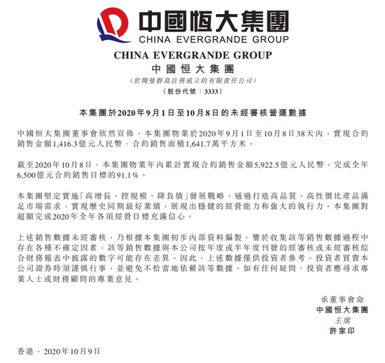 10月9日消息,中国恒大:9月与“十一”假期合约销售额达1416亿元,合约销售面积1,641.7万平方米。截至2020年10月8日,本集团物业年内累计实现合约销售金额5,922.5亿元人民币,完成全年6,500亿元合约销售目标的91.1%。
