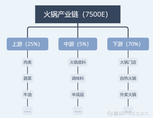 根据测算,整个火锅产业链的规模约为7500亿元,其中上游占整个产业链的25%、中游占整个产业链的5%,下游占整个产业链的70%。