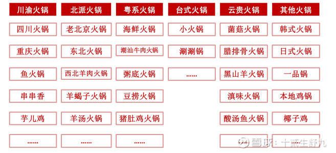 火锅的竞争格局按照地域的不同对国内火锅品类进行分类,可以分为川渝火锅、北派火锅、粤系火锅、台式火锅、云贵火锅。