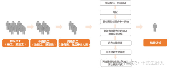 在海底捞实行的是“推荐制”与“内部选拔制”相结合的招聘选拔制度。对于普通员工来说,采用的是推荐制,而对于对中高层员工实行的是内部选拔制,除财务总监和工程总监外的其余管理层人员均来自基层的选拔晋升,任何一位员工均有可能通过“进入人才库-大堂经理-店长”的阶梯式晋升过程成为店面经理。