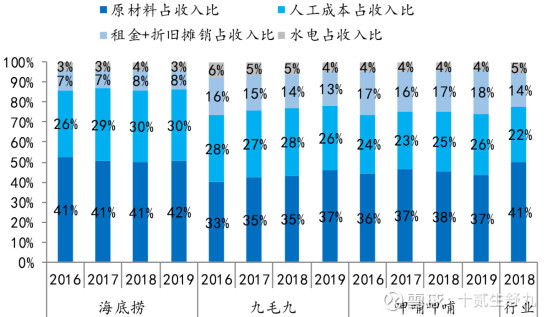 海底捞的租金是远远低于同行的,2019年海底捞的租金成本占营业收入比例为8%,2018年为8%,而行业的平均值是14%。这个数据呷哺呷哺是18%和17%,九毛九是13%和14%。