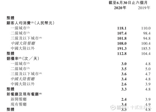 第一个是翻台率,由于受到疫情的影响,上半年总的翻台率在3.3次,比去年的4.8次下降了30%,而翻台率在8月份翻台率恢复八成,达到4次,这是一个非常优秀的数据,因为有新店的开业,但是整体的翻台率依然是能保持在较高的水平,如果疫情完全恢复的话,这个翻台率应该在4.5次。