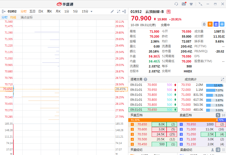 华盛资讯10月9日讯,云顶新耀-B今日正式挂牌港交所,股价高开28.27%,一度大涨30%,一手浮盈8250港元,最新市值200.4亿。该股在昨日暗盘交易中高开18.2%报65元获承接,最高见80元,收报72.05元,较上市价55元高31%或17.05元,成交795万股,涉资5.76亿元。不计手续费,每手500股,账面赚8525元。