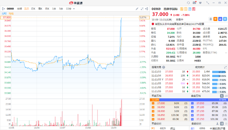 10月9日消息,思摩尔国际直线拉升,现涨7.09%,报37港元,市值达2156亿港元。