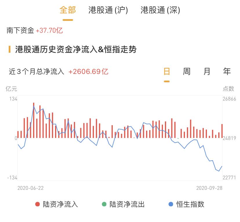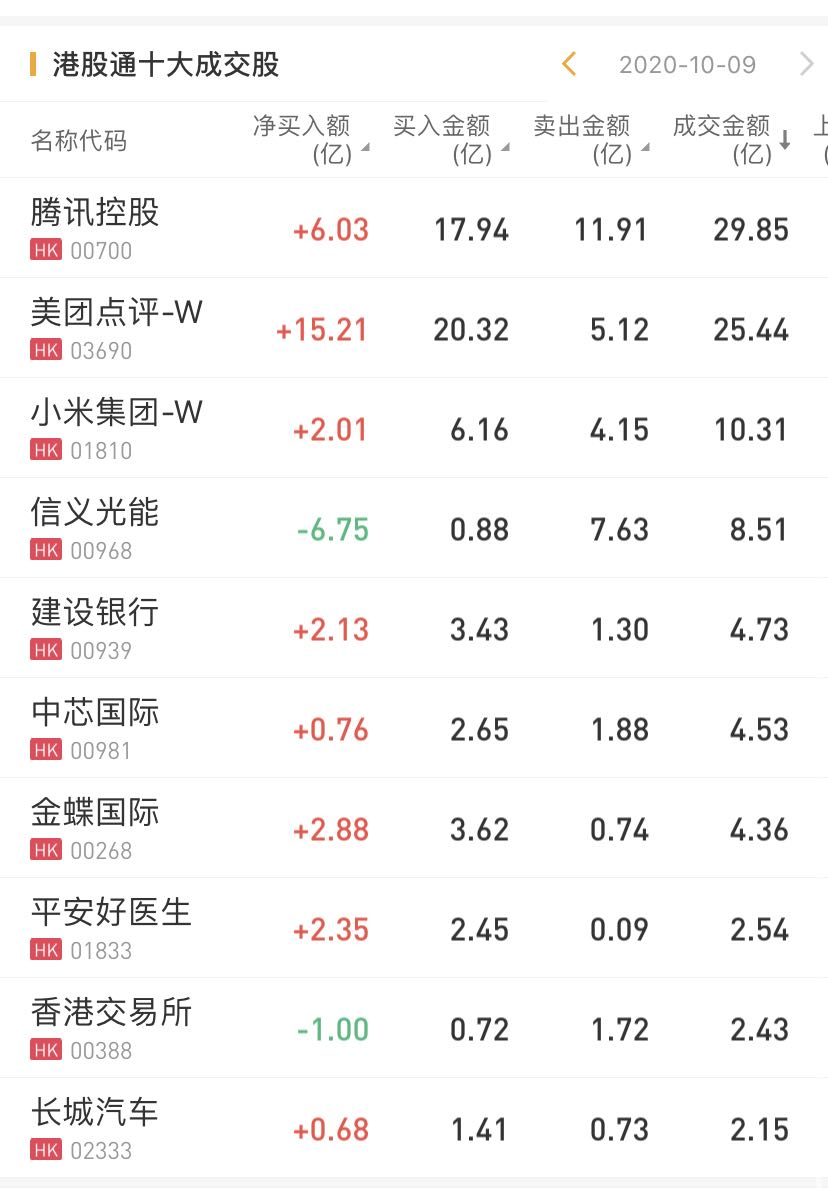 个股方面,今日南下资金净买入美团点评15.21亿港元,净买入腾讯控股6.03亿港元,净买入平安好医生2.35亿港元。