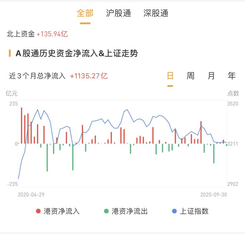 南下资金今日净流入港股37.7亿港元,北上资金今日净流入A股达到135.94亿元。