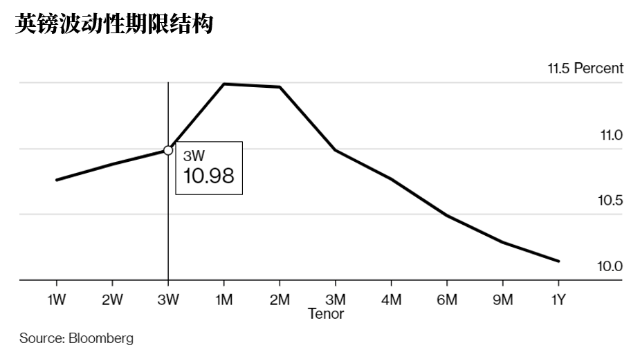 这两个假设刺激了市场对英镑看涨期权的需求,也导致英镑的波动率曲线出现大幅度的反转。下图可以看到,根据市场预期,英镑的波动率会在一个月后升至峰值,这远远超出了英国自己设定的10月15日与欧盟达成协议的最后期限,但恰好赶上11月3日美国大选的最后期限。