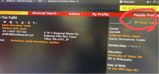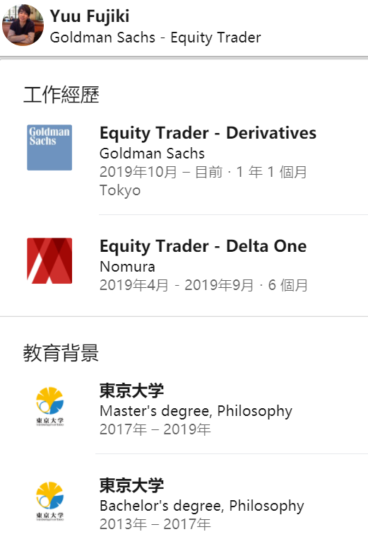两人中,Yuu Fujiki的领英履历可供查询。领英显示,Yuu Fujiki工作经验不足两年,目测薪资只是entry level。他于2019年毕业,在东京大学取得哲学系本硕学位,最长的一段工作经历为高盛的股票及衍生品交易员。