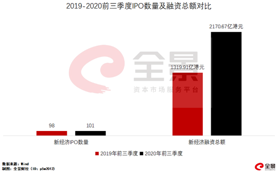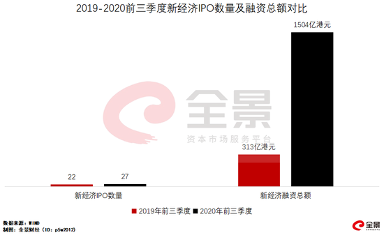 2020年前三季度,共有27只新经济相关新股上市,数量同比增长23%,涉及募资金额达到1504亿港元,较2019年同期增幅高达381%。其中前五只超大型新股中四只富有新经济元素,包括3只第二上市的中概股,融资共计1043亿港元,较去年同期的662亿港元增加58%。