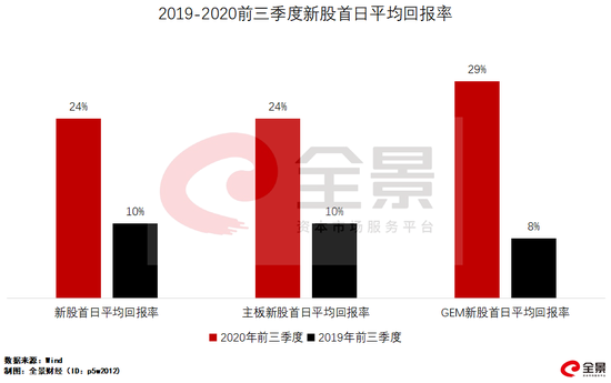 而从整体角度看,2020年前三季度港股所有新股的首日平均回报率为+24% ,比去年同期的+10%的水平出现翻倍,并且主板、创业板均呈现上行态势。其中主板新股今年所带来+24%的首日平均回报率,较去年同期的+10%翻倍;创业板新股首日平均回报率为+29% ,比去年的+8%增幅更为明显。