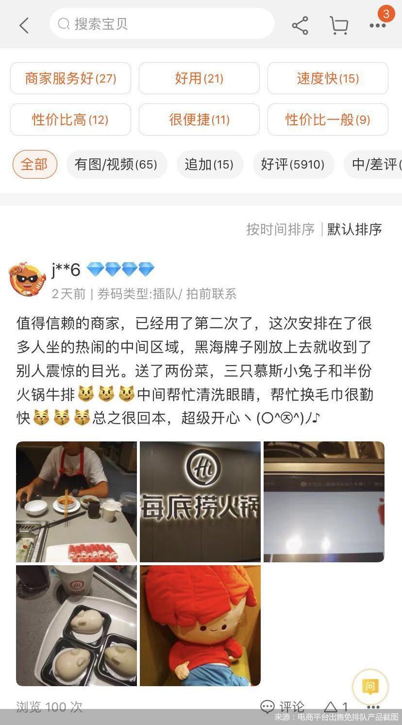 早在今年一月份,抖音平台便有消费者爆料,在某电商平台充斥着大量的海底捞免排队服务产品,其中排名第一的服务产品月售销量超过3000人付款,并有部分顾客评论已不止第一次购买,表示会多次回购。也有消费者表示,海底捞免排队的费用在10-40元左右,相当于一顿外卖,费用偏高。
