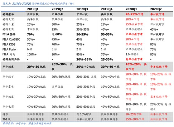 受益于一贯的高景气度,运动鞋服终端流水恢复迅速。1) ) 国际品牌方面,据公司公告,阿迪达斯 5-6 月在大中华区终端流水由 Q1 的大幅下滑恢复至同比双位数增长、亚瑟士品牌Q2大中华区销售同增 23%,耐克实现正增长。2 ) 国内品牌方面,Q2 安踏/李宁/特步流水降幅缩窄至个位数,FILA/迪桑特流水分别同增 10%+/40%+。分渠道来看,电商渠道业务成为重要增长点,单 Q2 安踏/李宁品牌电商均环比 Q1 提速,分别同增40%+/20%+。
