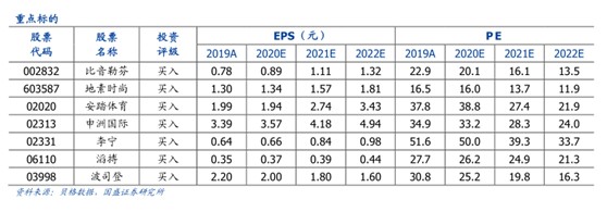 我们自上而下看好高景气度的运动鞋服赛道,推荐申洲国际、安踏体育、李宁、滔搏,目前对应 21 年 PE 分别为 28/27/39/25 倍。持续推荐优质品牌服饰标的,推荐秋冬旺季到来拉动销售的波司登,对应21年PE为20倍;推荐运营稳健、估值水平尚有提升空间的地素时尚、比音勒芬,对应 21年 PE 分别为 14/16 倍。