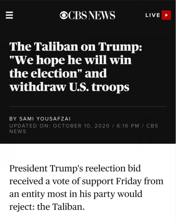 但据美媒Axios的最新消息,特朗普的竞选团队坚决拒绝了塔利班对他连任的支持。特朗普竞选团队的发言人10日称,“塔利班应当知道特朗普总统将永远维护的是美国的利益。”