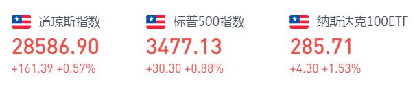 上周五道指涨161.39点,或0.57%,报28586.90点;纳指涨158.96点,或1.39%,报11579.94点;标普500指数涨30.30点,或0.88%,报3477.13点。