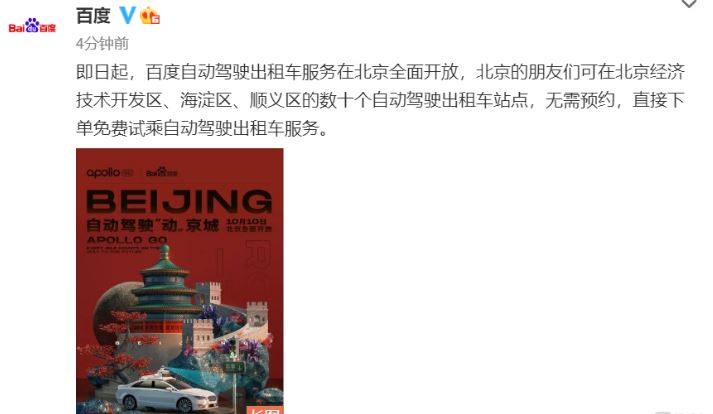 百度官方微博10月11日消息,即日起,百度自动驾驶出租车服务在北京全面开放,北京的朋友们可在北京经济技术开发区、海淀区、顺义区的数十个自动驾驶出租车站点,无需预约,直接下单免费试乘自动驾驶出租车服务。