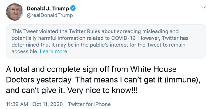 原标题:真•尴尬!特朗普刚发推宣布自己已对新冠免疫,推特马上标记:“传播误导信息”