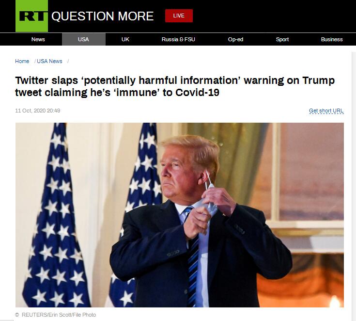 (RT:推特对特朗普称自己对新冠“免疫”的推文发出“潜在有害信息”警告)
