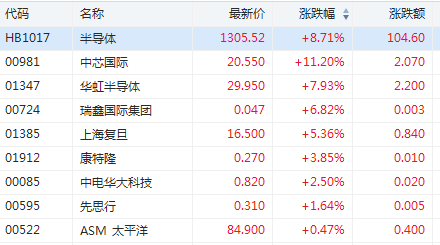 10月12日消息,港股半导体板块走强,中芯国际领涨,涨11%,华虹半导体涨7.93%,上海复旦涨5.36%,康特隆涨3.85%,中电华大科技涨2.5%,ASM太平洋涨0.47%。