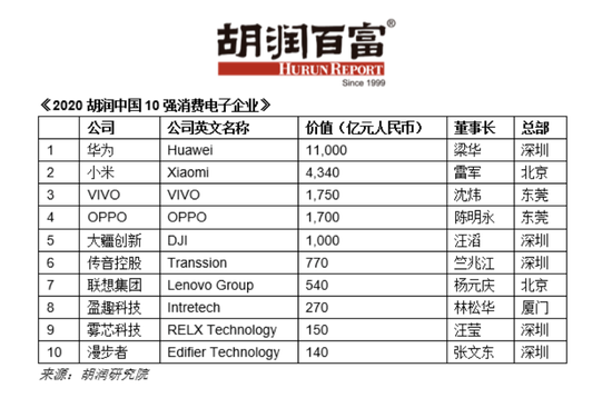 此外,胡润百富今日发布《2020胡润中国10强消费电子企业》,华为以1.1万亿价值成为中国最值钱消费电子企业,小米以4340亿价值排名第二。vivo价值首次超过OPPO,以1750亿排名第三;OPPO以1700亿排名第四。