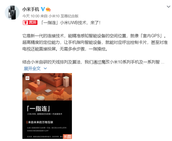 10月12日,小米宣布发布UWB技术,该技术支持小米UWB技术的手机可以实现对智能设备的厘米级定位,指向任意智能设备都可直接控制,角度测量精度可达±3°,如同高精版“室内GPS”。