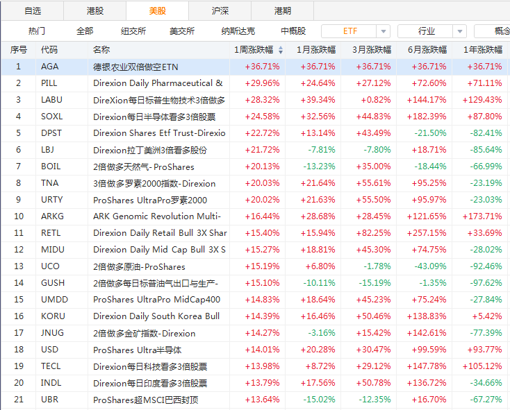 从美股ETF涨幅榜可以看出,强势ETF都是多头阵地,医疗、半导体、金融、科技是领涨板块,其中3倍做多医药股的PILL和LABU分别大涨近30%和28.32%,占据了排行榜前两位(AGA已退市)。