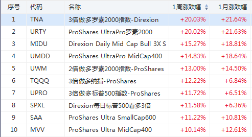 而弹性最大的小盘股也是乘风而上领涨各大指数,3倍做多罗素2000指数的TNA和URTY是上周表现最好的指数ETF,累计涨幅都超过20%,垄断排行榜前两位。