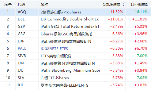随着美元走软,以及投资者对美国新一轮财政刺激方案的乐观预期,上周金价上涨约1%,白银期货一周累计上涨4.5%,做多白银的AGQ周涨11.52%,成为商品ETF最大的亮点。