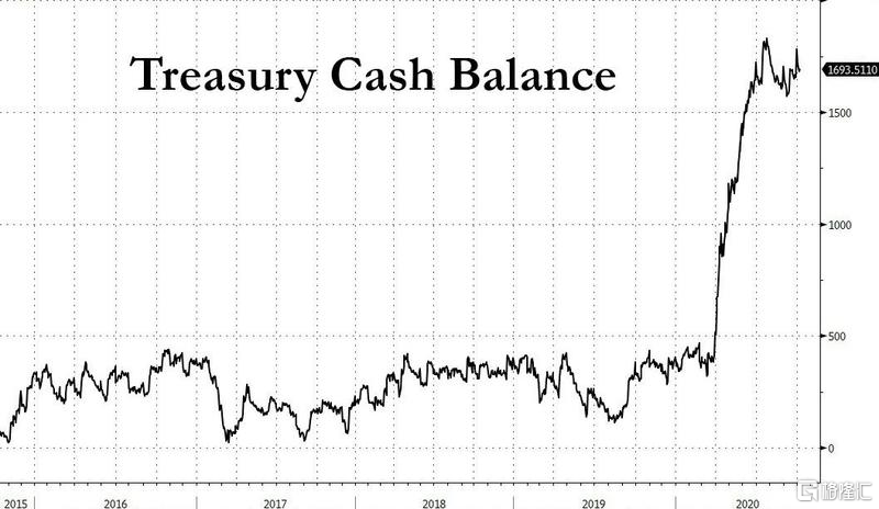 这导致一个严重后果——美国国库现金余额一直高企。如下图所示,美国国库现金余额从3月底的4000亿美元激增至目前略高于1.7万亿美元的历史新高,这一增幅接近于此前国会批准的援助计划金额。