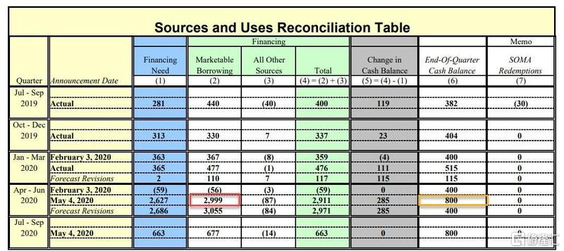 早在5月4日,美国财政部公布了其在4月至6月这一季度的预算案,其显示财政部将借入一笔价值近3万亿美元的巨额贷款(2.999万亿美元)。这一数字远远高于其在今年2月初的预期,当时财政部预计当季度债务将减少560亿美元。