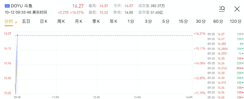 华盛资讯10月12日讯,虎牙、斗鱼联合宣布双方已签订“合并协议与计划”,但两家企业股价走势相背。截止发稿,斗鱼大涨超16%,报16.27美元;虎牙一度跌近10%,现跌7.41%,报23.88美元。
