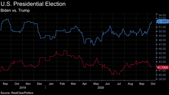 RealClearPolitics数据显示,10月12日,乔·拜登的民调支持率平均为52.3%,唐纳德·特朗普为41.7%。