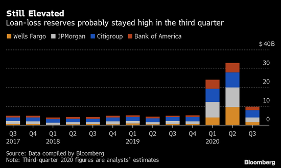 彭博汇总的分析师预测数据显示,尽管在政府和美联储刺激政策的帮助下,到目前为止还没有出现大规模违约,但美国四大银行在第三季度可能依然增加了100亿美元的坏账拨备。
