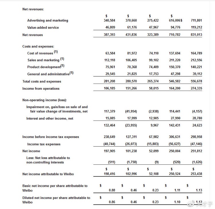 归属于微博的净利润为1.984亿美元,摊薄后的每股净利润为0.86美元。