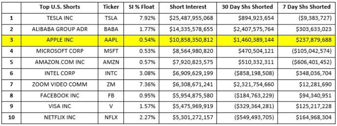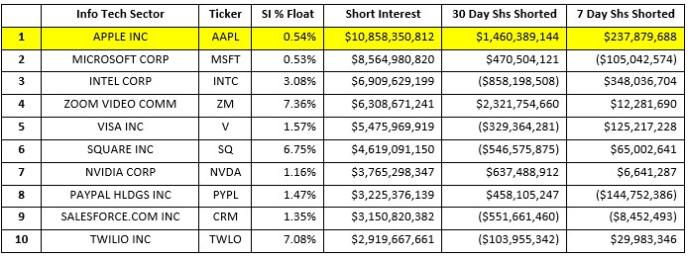 此外,在美国IT行业中,苹果则为该行业中做空规模最大的股票: