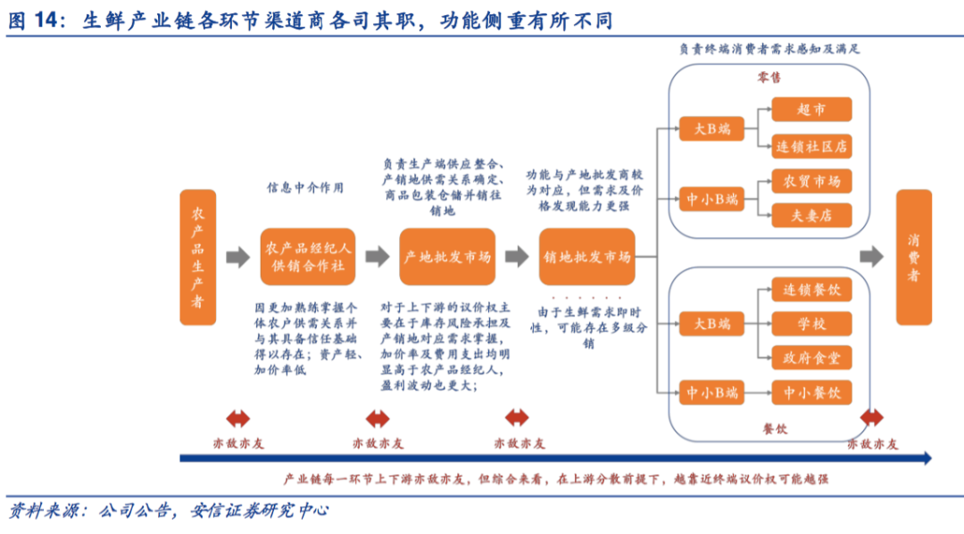 安信证券的刘文正在《量化分析:从流通成本角度看国内生鲜产业链及终端渠道变革》中指出,国内生鲜产业链的问题在于,在品牌价值极弱条件下,消费者却要为高额流通成本买单。生鲜产业链将向流通成本更低的方向变化。