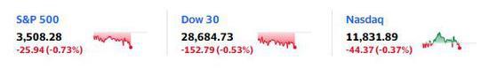 美股三大指数也低开低走,午盘时,道指跌超150点,标普500指数跌超0.7%,纳指也重新转跌。