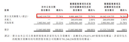 配售事项完成后,许家印持股从77.78%减少至76.26%。