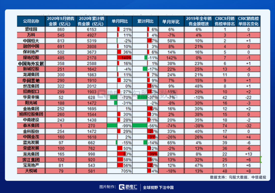 其中,从1-9月份累计销售额来看,比较突出的有中国恒大同比增长17%,世茂集团16%,招商蛇口17%,金地集团19%,旭辉集团13%,中南建设11%,金科股份21%,龙光集团39%,中国金茂30.7%,绿城中国43.3%。