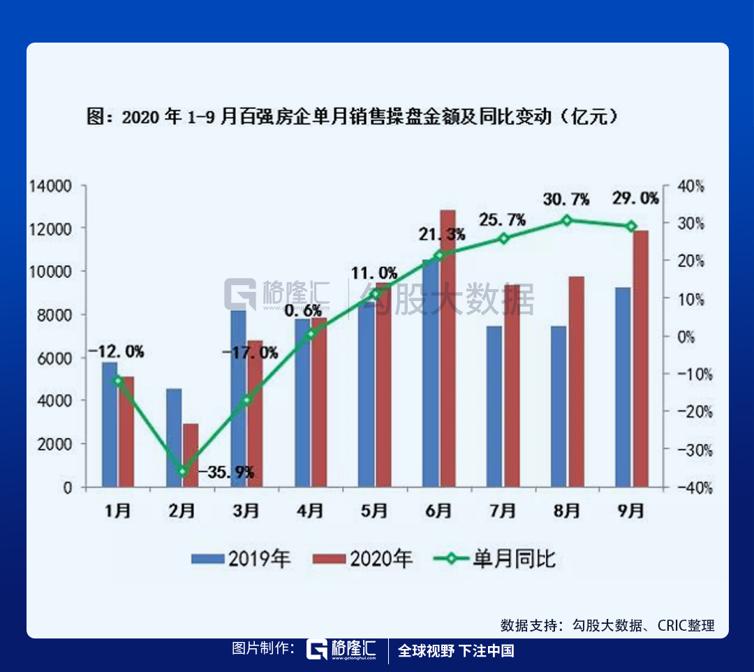 虽然9月份的销售增速较8月份有所放缓,但整体来看前三个季度的数据是超预期的。2019年前三季度百强房企的操盘销售额24166.9亿元,今年同期是31053.7亿元,同比增长28.5%;销售端今年完全没有受到疫情影响。