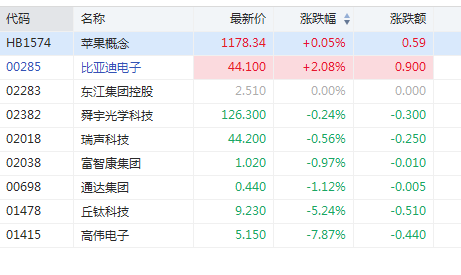 10月14日消息,港股苹果概念股跳水,高伟电子跌7.87%,丘钛科技跌5.24%,瑞声科技跌0.56%,舜宇光学跌0.24%。