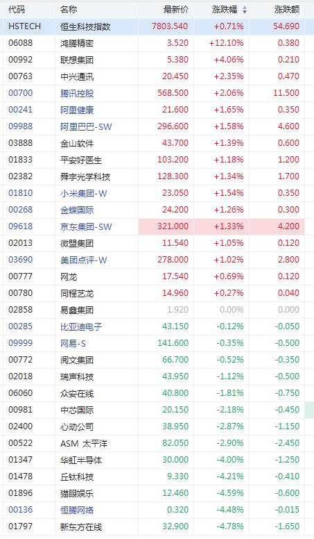 腾讯涨超2%,阿里、小米、京东、美团涨超1%。