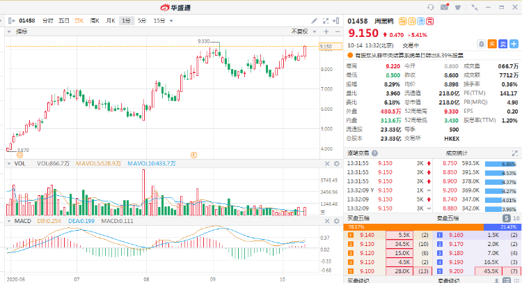 周黑鸭(1458.HK)午后急涨至5.41%,高见9.22港元逼近历史新高价,暂成交7712万港元,总市值218亿港元。