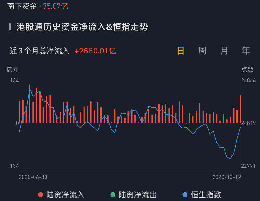 南下资金今日净流入港股75.07亿港元,继昨日陆港通休市后再度大幅流入。