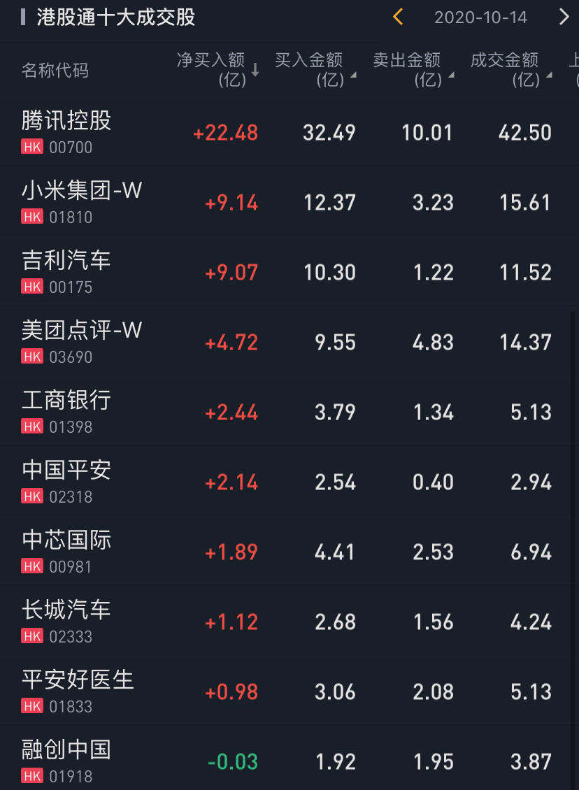 个股方面,今日南下资金净买入腾讯控股22.48亿港元,净买入小米集团-W9.14亿港元,净买入吉利汽车9.07亿港元,净买入美团点评-W4.72亿港元。