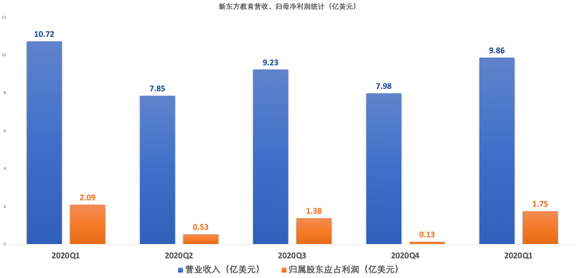 根据公告,新东方Q1录得营业收入9.86亿美元,同比下滑8%。